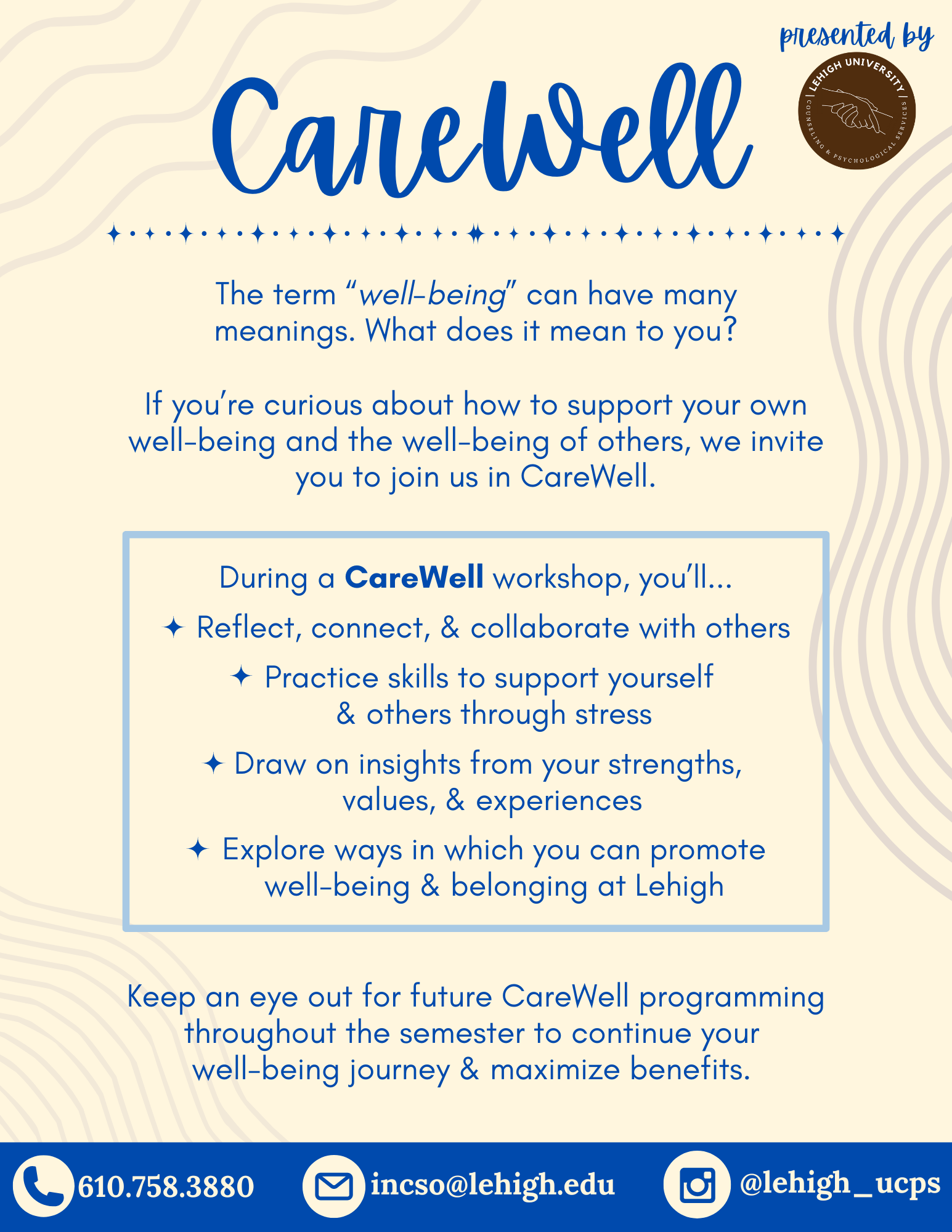 These trainings are available for all Lehigh Staff, Faculty, and Students. Sign up for individual workshops at go.lehigh.edu/LUcarewell.