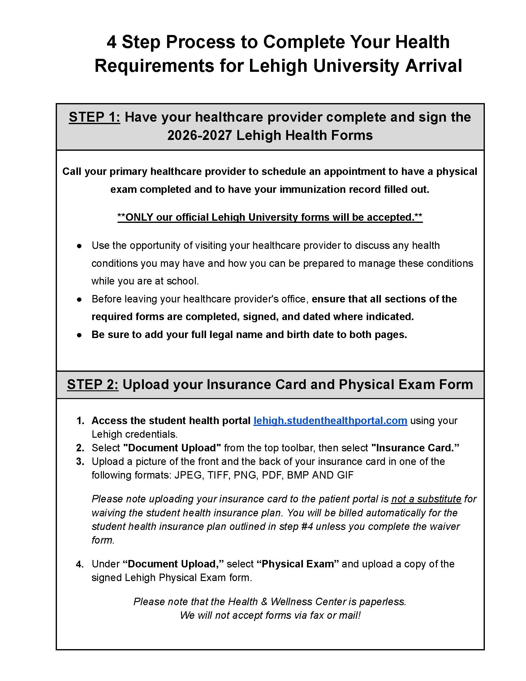Please note that the Health & Wellness Center is paperless so we will not accept forms via fax or mail! |